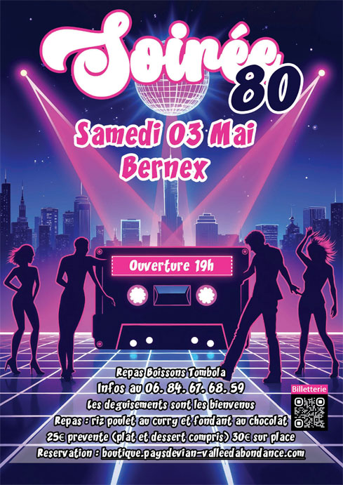 Le samedi 3 mai à Bernex, replongez dans l’ambiance unique des années 1980, des cassettes, des boules à facettes et des tubes inoubliables. Sortez vos vestes à paillettes, vos bandanas et vos plus beaux déhanchés : la Soirée 80 débarque, et ça va envoyer du lourd !